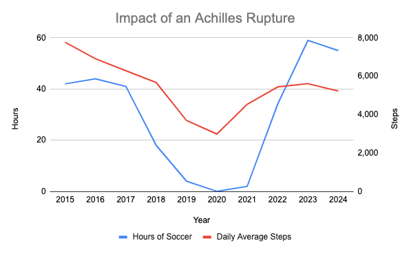 For you data nerds, here's the impact a torn achilles (and a global pandemic) had on my soccer activity and average daily step count: